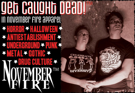 November Fire is a creative outlet conceived by Strephon Taylor, and it was born from a long road of business and art adventures. Primarily a t-shirt design art house, we carry Patches, DVD’s, CD's, Masks, Stickers, and Horror Accessories as well. Our goal is to cater to like-minded individuals with a dark sense of style and fun. If you dig horror, Halloween, antiestablishment, and/or drug culture themes you have found some common ground in November Fire.