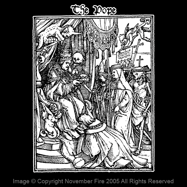Let another take his office. Psalm cix, 8 Pride dreams an earthly immortality, But Death is certain - sudden to destroy; And even thou, high-priest, shalt surely die, And a successor thy proud throne enjoy. The Dance of Death, 1538 Code:NFTDD009 |
