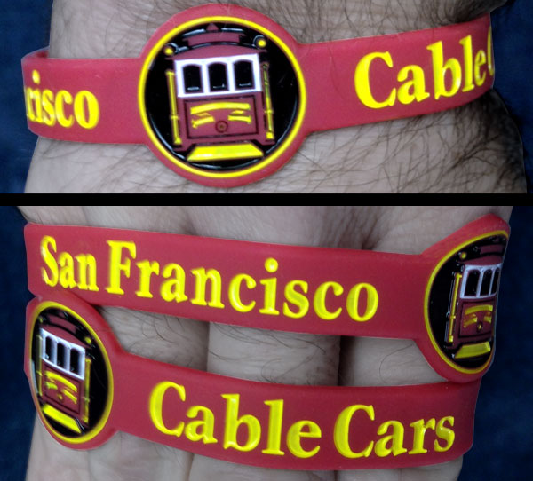 Maybe not as fun as hopping on one of San Francisco's historic Cable Cars but this four color watch style silicone wristband will liven up your fashion starved arm!! Beautifully molded front facing California combination Cable Car emblazoned with the text "San Francisco Cable Cars"