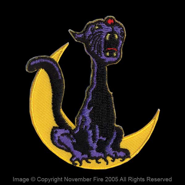 The overcast sky glows with an eerie moon yellow light. The wind whispers through the trees on a lonely and dark back alley. Off in the distance you hear the haunting calls of a tomcat. Is it Halloween? Not yet, but this killer little cat patch will put you in the mood every time you take a gander at it!