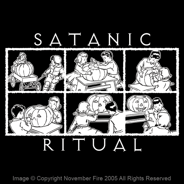 Watch out kiddies, Halloween is a pagan holiday! It is the night that Satan comes out to corrupt the tiny souls of good little boys and girls. Never mind poverty, capital punishment, health care, and any number of real problems. No, we have people who really think that carving a jack-o-lantern is a satanic ritual. Nut jobs! This is a fun design for all you “devil worshippers” running around in the shadows.
