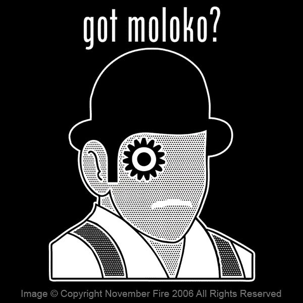"There was me, Alex, and my three droogs, that is Pete, Georgie, and Dim; and we sat in the Korova Milkbar sold moloko-plus, wich is what we were drinking. This would sharpen you up and make you ready for a bit of the old ultraviolence"