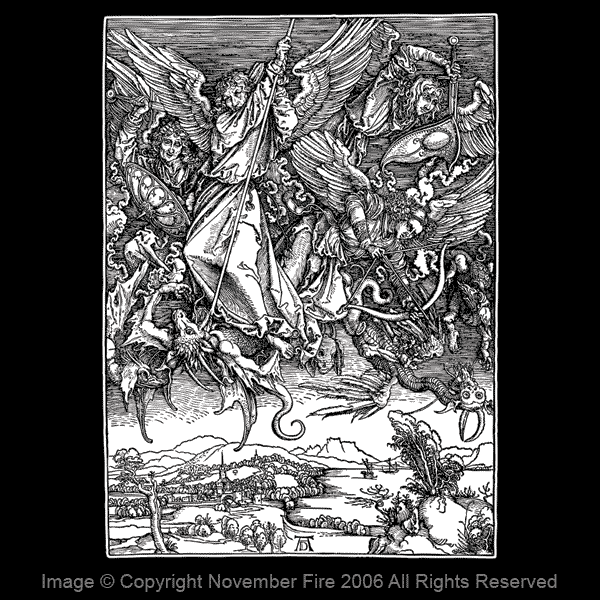 St. Michael evicting Lucifer and the fallen angels from Heaven. From Albrecht Durer,s Apocalypse, Nuremberg, 1498.