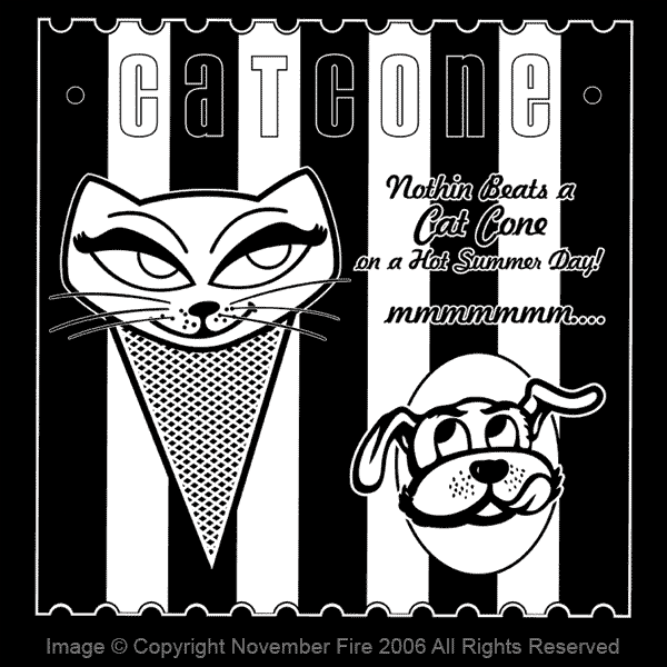 Nothing Beats a Cat Cone on a Hot Summer Day! Since the dawn of time dogs have hated cats and would like nothing more than to have a little truck serving up cat cones to them. It has also been pointed out to us that this design may have some sort of underlying sexual reference to it? Why that sounds ridiculous, it is clearly just referring to a dog licking a pussy-cat on a hot summer day.