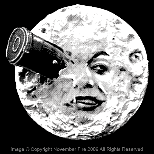 Le Voyage dans la Lune, A Trip to the Moon (France, 1902), the screen's first science fiction story, a masterpiece created by imaginative French director and master magician Georges Melies in his version of the Jules Verne story. The silent film's plot, a light-hearted satire criticizing the conservative scientific community of its time, was inspired by Jules Verne's From the Earth to the Moon and H. G. Wells' First Men in the Moon. We used the whimsically fun rocket in the eye man in the moon for this design.