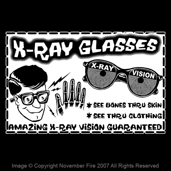 X-Ray Glasses are an American novelty item, purported to allow the user to see through or into solid objects. Instead, though, the glasses merely create an optical illusion; no X-rays are involved. I seen your underpants! Code:NFT353 |