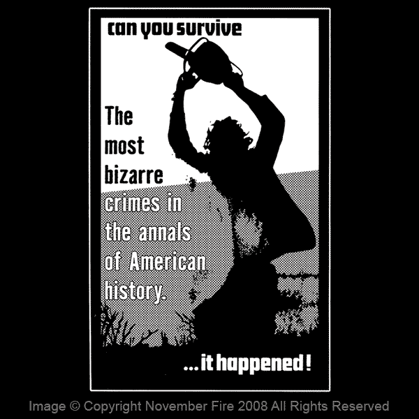 The story which this t-shirt is based is an account of the tragedy which befell a group of five youths, in particular Sally Hardesty and her invalid brother, Franklin. It is all the more tragic in that they were young. But, had they lived very, very long lives, they could not have expected nor would they have wished to see as much of the mad and macabre as they were to see that day. For them an idyllic summer afternoon drive became a nightmare. The events of that day were to lead to the discovery of one of the most bizarre crimes in the annals of American history.